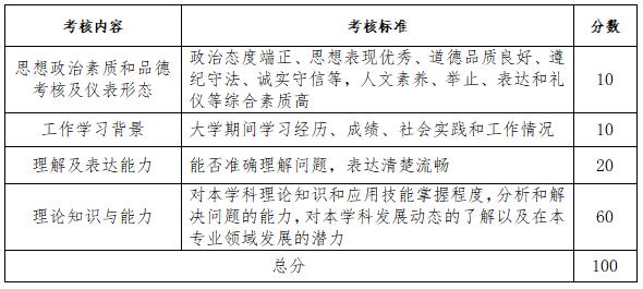 综合面试时间原则上为20分钟。如考生在规定时间内回答完毕,认为不必要再进行回答,可向考官报告“回答完毕”;如考生回答问题超过规定时间上限,经提醒后,考官有权结束面试。满分100分,复试小组专家现场独立评分,取中间分,现场公布成绩,考生现场确认成绩。