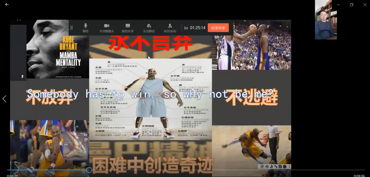 4月1日,荣霁老师结合体育时事围绕《体育明星的个体文化价值——科比离世引发的深度思考》为主题进行线上学术沙龙活动,组织学生对科比离世引发的文化价值思考进行网络视频汇报。学生们从社会贡献、人生价值、文化符号等不同视角对体育明星文化价值做了深入的思考,阐述内容条理性强,汇报精彩。